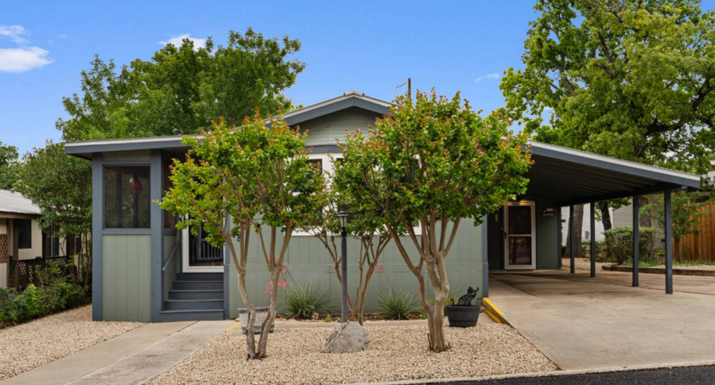 Step into a thoughtfully updated 2-bedroom, 2-bath home with a fully large flex room and equipped guest cottage 1/1, offering comfort, flexibility, and standout features throughout. A bright, breezy screened porch welcomes you in-ideal for morning coffee, evening unwinding, or giving pets a favorite hangout spot. Inside, the open-concept layout connects the living, dining, and kitchen areas, all filled with natural light. The split-bedroom design provides privacy, while the primary suite has been beautifully refreshed with a deep soaking tub, stylish tile, updated fixtures, fresh paint, and generous storage including two walk-in closets plus a linen closet. Step down into the flex space this wonderful addition features amazing natural light multiple windows and extends almost the entire length of the home. This flex area could be an office/study or crafting area or easily used as a third bedroom in the main residence. Step outside the low-maintenance landscaped yard features mature oaks, crepe myrtles, and ash trees, along with space for vegetable or flower beds. An oversized driveway and carport provide convenient covered access. Recent improvements include exterior paint, a durable metal roof, upgraded lighting and ceiling fans, plumbing enhancements, a mobility-friendly shower, and updated door hardware-adding both style and peace of mind. The separate guest cottage offers a full 1 bedroom, 1-bath setup with its own kitchen and comfortable living spaces, making it ideal for visitors, extended family, or a private office. Located in The Wilderness Retirement Community just north of Kerrville, residents enjoy access to two clubhouses, a pool, and included services such as water, sewer, trash, basic internet, and cable-all covered by the monthly park fee. Wonderful space quality and value a must see on your list!